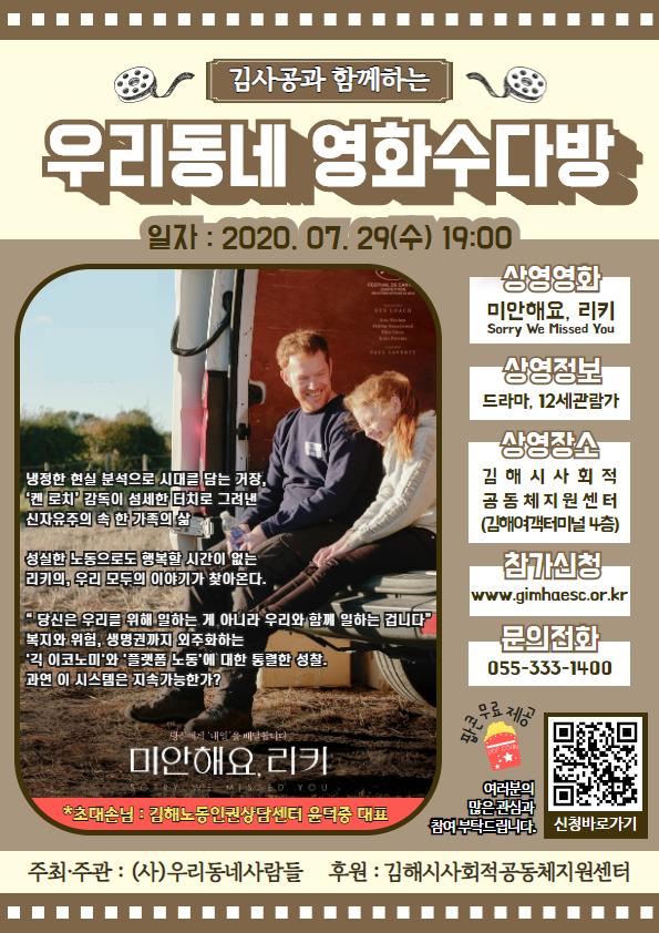 이번달은 냉정한 현실 분석으로 시대를 담는 거장, ‘켄 로치’ 감독이 섬세한 터치로 그려낸 신자유주의 속 한 가족의 삶 성실한 노동으로도 행복할 시간이 없는 리키의, 우리 모두의 이야기가 잘 나타난 <미안해요, 리키>를 상영하였습니다. 초대손님인 김해노동인구너상담센터 윤덕중 대표님과 영화가 끝난 후 노동의 현실 등 뜻 깊은 이야기를 나눌 수 있어서 좋았습니다