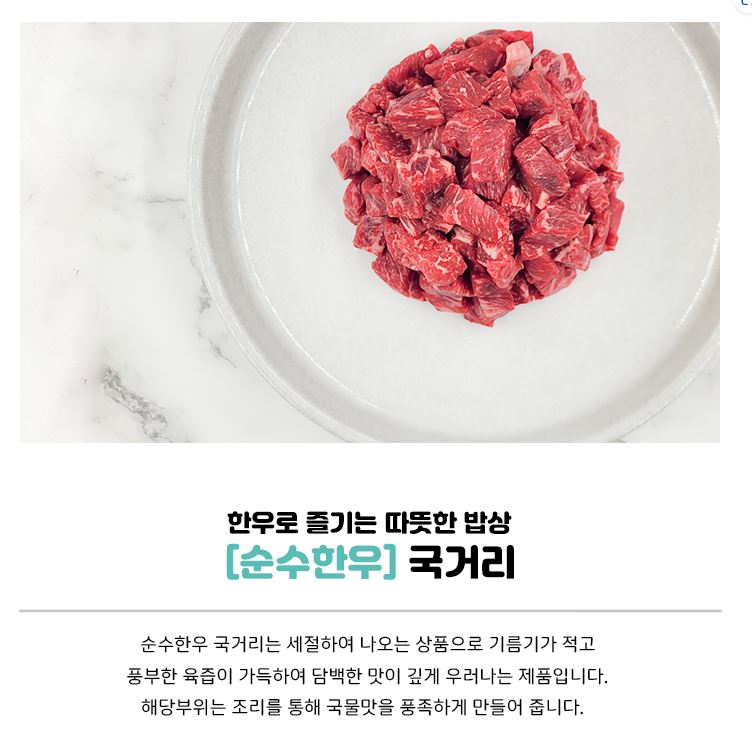 • 제품정보순수한우 국거리는 세절하여 나오는 상품으로 기름기가 적고, 풍부한 육즙이 가득하여 담백한 맛이 깊게 우러나는 제품입니다. 해당부위는 조리를 통해 국물맛을 풍족하게 만들어 줍니다.