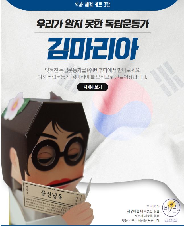 • 제품정보종이로 만드는 역사 체험 키트 3탄/우리가 알지 못한 독립운동가 "김마리아" // 잊혀진 독립운동가를 (주)비추다에서 만나보세요. 여성독립운동가 '김마리아'를 모티브로 만들었어요