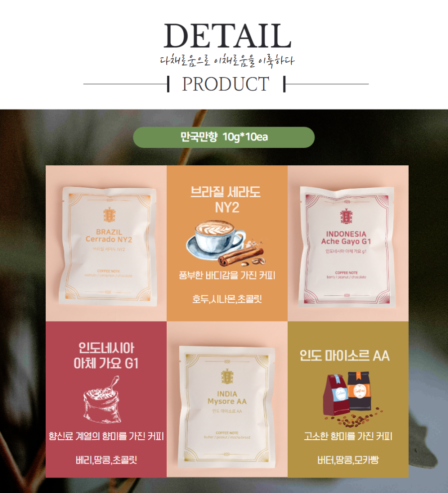 • 제품정보소박하되 고요한 빛깔의 존재들이 한데 어우러져 깊고 고운 풍미의 커피를 만듭니다. // 다양한 구성의 커피를 만나볼수 있어요. 상단 구매처로 들어오세요~