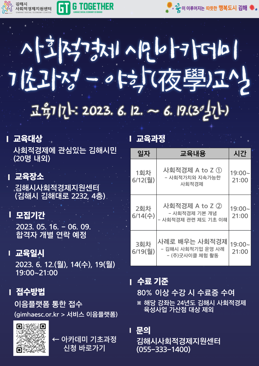 사회적경제 시민 아카데미 기초과정 야학교실 일시 : 23. 6. 12.(월), 14(수), 19(월) 19:00~21:00 장소 : 김해시사회적경제지원센터 대상 : 김해시민 20명 내외 내용 : 사회적경제와 사회적가치 개념 이해, 선배 기업인과의 만남 수료 : 80% 이상 이수 시 수료증 증정 (기초과정만 수료 시 24년 김해시 사회적경제 육성사업 가산점 대상 제외)