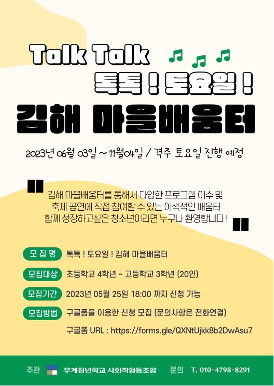 • 제품정보무계청년학교 사회적협동조합에서 김해 마을배움터 사업을 추진하고자 합니다. / 톡톡! 토요일! 김해 마을배움터의 다양한 교육활동및 문화예술양성을 위한 프로그램을 진행할 예정이니 많은 관심바랍니다.