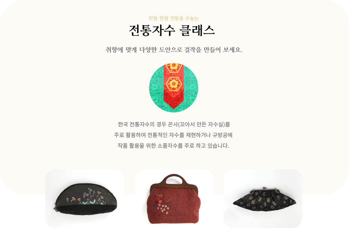 • 제품정보한땀한땀 전통을 수놓는 전통자수 클래스//취향에 맞게 다양한 도안으로 걸작을 만들어 보세요~ //문의 사항은 상단 메일이나, 홈페이지 게시판을 이용해 주세요 //인내심과 관심만 있으면 누구든지 배울수 있어요~^^