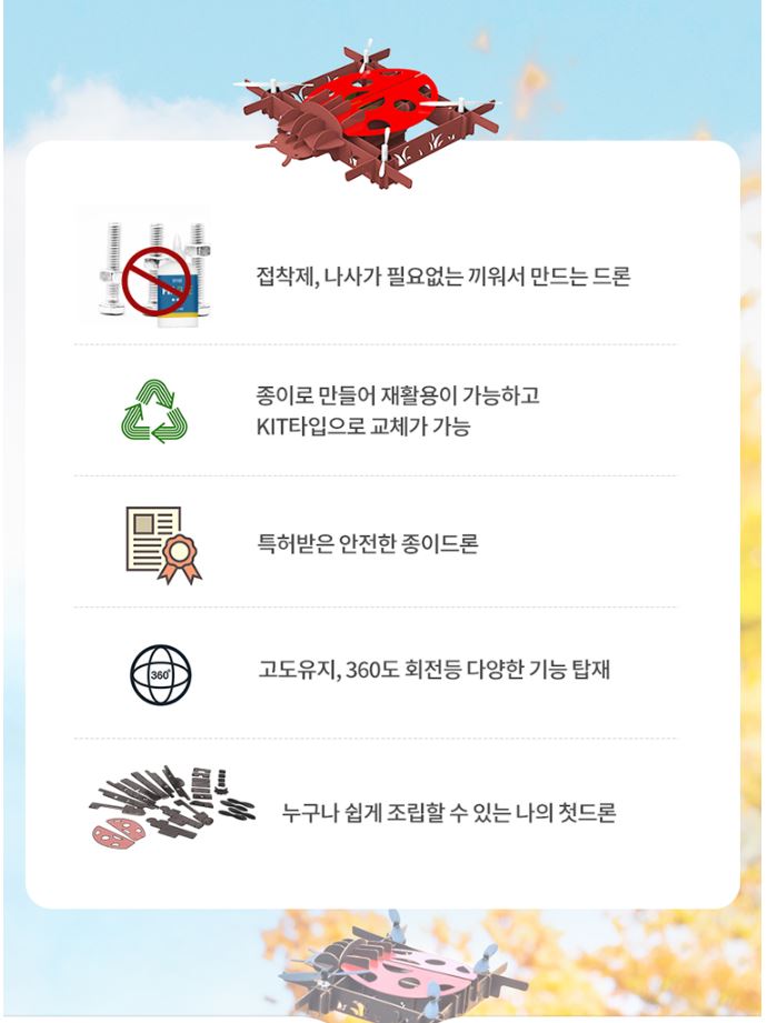 • 제품정보입문용 무당벌레 드론입니다. 교육용 실내용으로 사용 가능합니다.//드론연습을 원하시는 분에게 드론의 원리와 구조를 알수있는 종이드론을 추천합니다. //할인가 37,400원