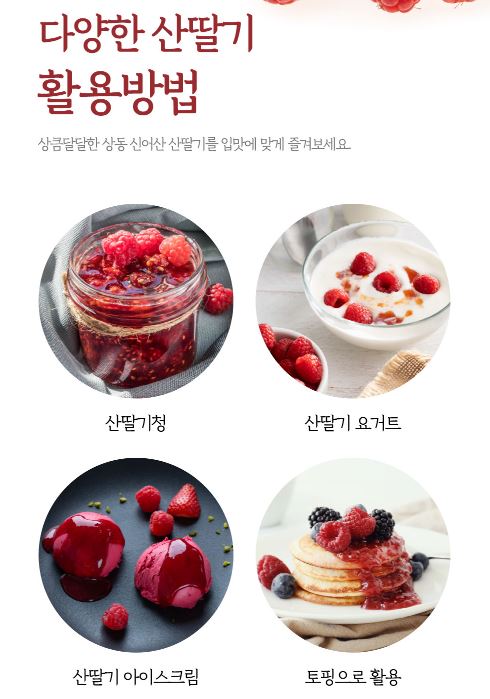 • 제품정보상동 신어산 산딸기는 안토시아닌, 비타민C, 폴리페놀, 칼륨, 피토에스트로겐, 비타민E, 베타카로틴 등 다양한 성분이 함유된 알칼리성 과실입니다. / 100g 22Kcal의 낮은 열량과 풍부한 식이섬유로 다이어트에 좋으며, 혈액순환에도 도움을 주어 동맥경화, 고혈압ㅂ 예방 효과가 있습니다.
