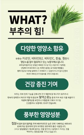 • 제품정보뜨락영농에서는 믿고 드실수 있는 건강함을 담았습니다./ 카로틴.니아신.엽산.비타민C.비타민A.칼륨이 함유된 부추입니다.