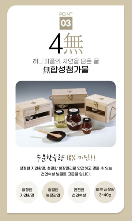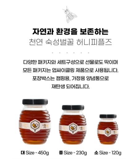 • 제품정보자연과 환경을 보존하는 천연숙성벌꿀 허니피플즈/ 다양한 패키지와 세트구성으로 선물로도 딱이며, 모든패키지는 업싸이클링 제품으로 사용됩니다. 포장박스는 캠핑요, 가정용 양념통으로 재탄생 도어집니다.