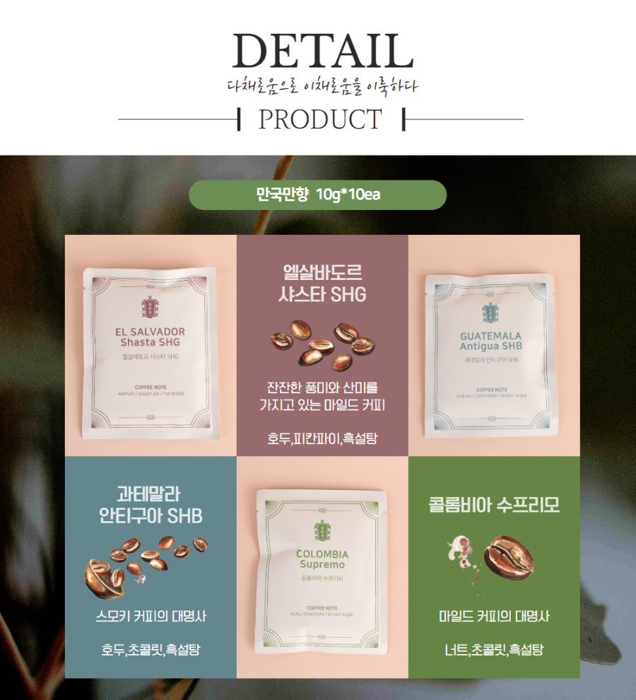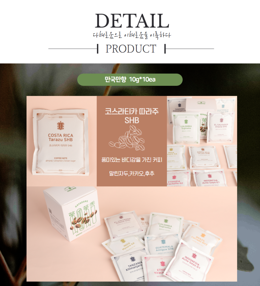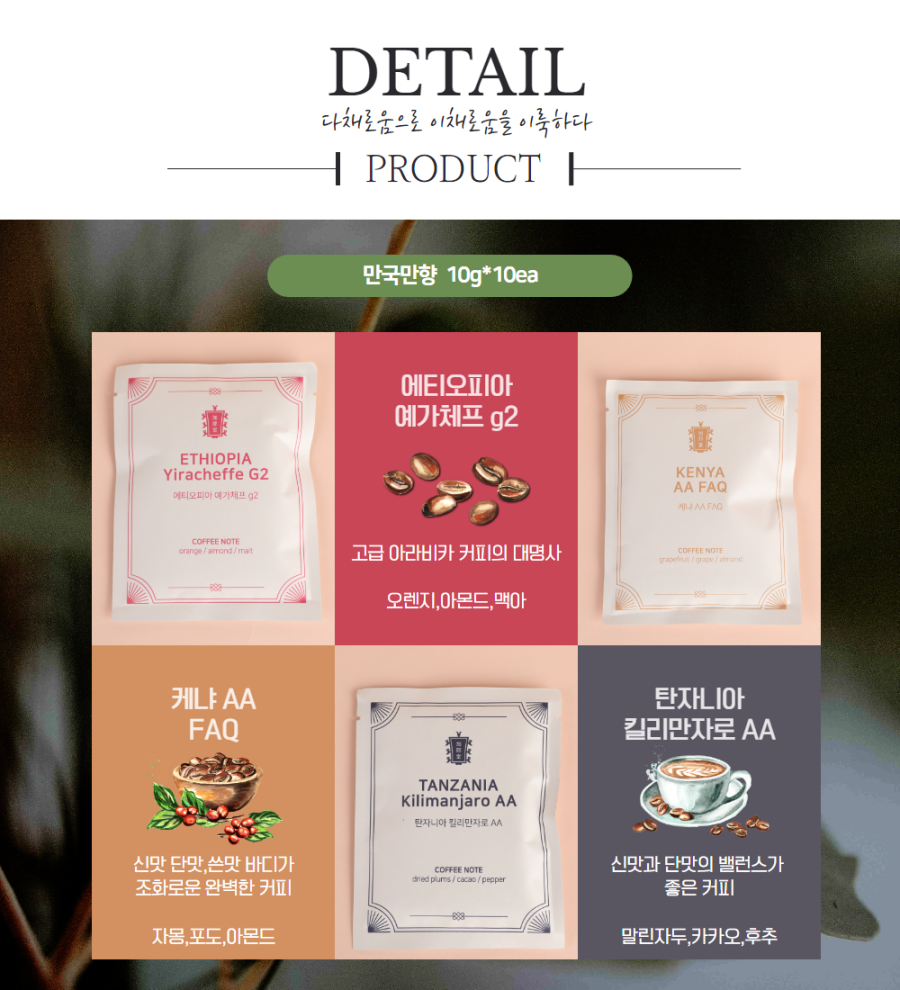 • 제품정보소박하되 고요한 빛깔의 존재들이 한데 어우러져 깊고 고운 풍미의 커피를 만듭니다. // 다양한 구성의 커피를 만나볼수 있어요. 상단 구매처로 들어오세요~