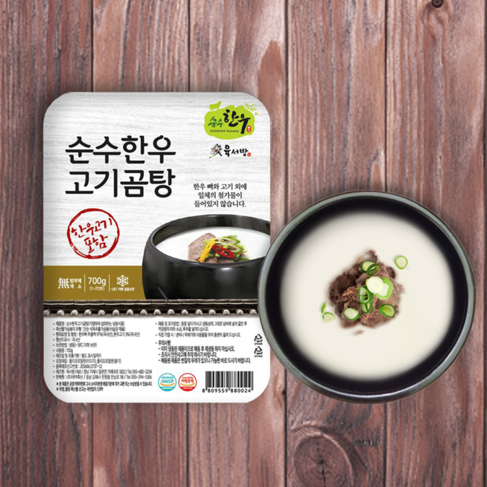 • 제품정보순수한우 수제 곰탕은 100% 한우만을 우려내어 뼈외에 일체 첨가물이 들어가지 않은 순수한 곰탕입니다. 곰탕 및 다양한 국물요리의 베이스로도 활용이 훌륭한 제품입니다.