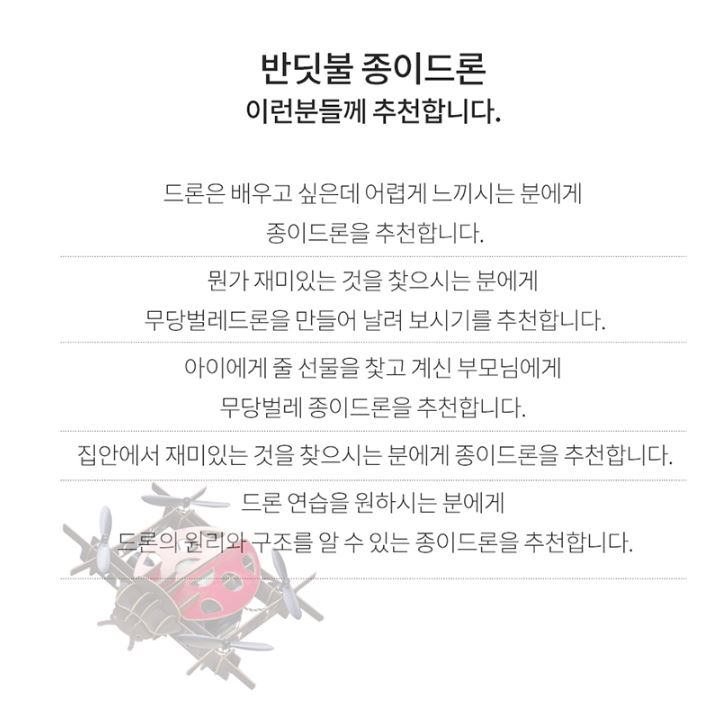 • 제품정보입문용 무당벌레 드론입니다. 교육용 실내용으로 사용 가능합니다.//드론연습을 원하시는 분에게 드론의 원리와 구조를 알수있는 종이드론을 추천합니다. //할인가 37,400원