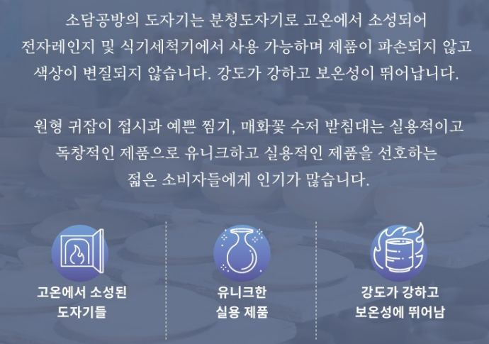 • 제품정보장인의 손길이 완성해 낸 핸드메이드 제품으로 고온에서 소성되어 잘 파손되지 않고 견고한 기능적인 테이블웨어 식기세척기가능 전자레인지가능
