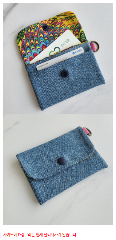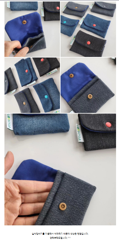• 제품정보가볍고 수납력이 좋은 데님 '카드명함지갑' 입니다. 돈도 넣고 카드도 넣고 명함도 넣습니다. 실제 청바지를 이용해서 제작했기 때문에 색상은 랜덤입니다. 체험용으로 활용하실 수 있도록 반제품 제작도 가능합니다.