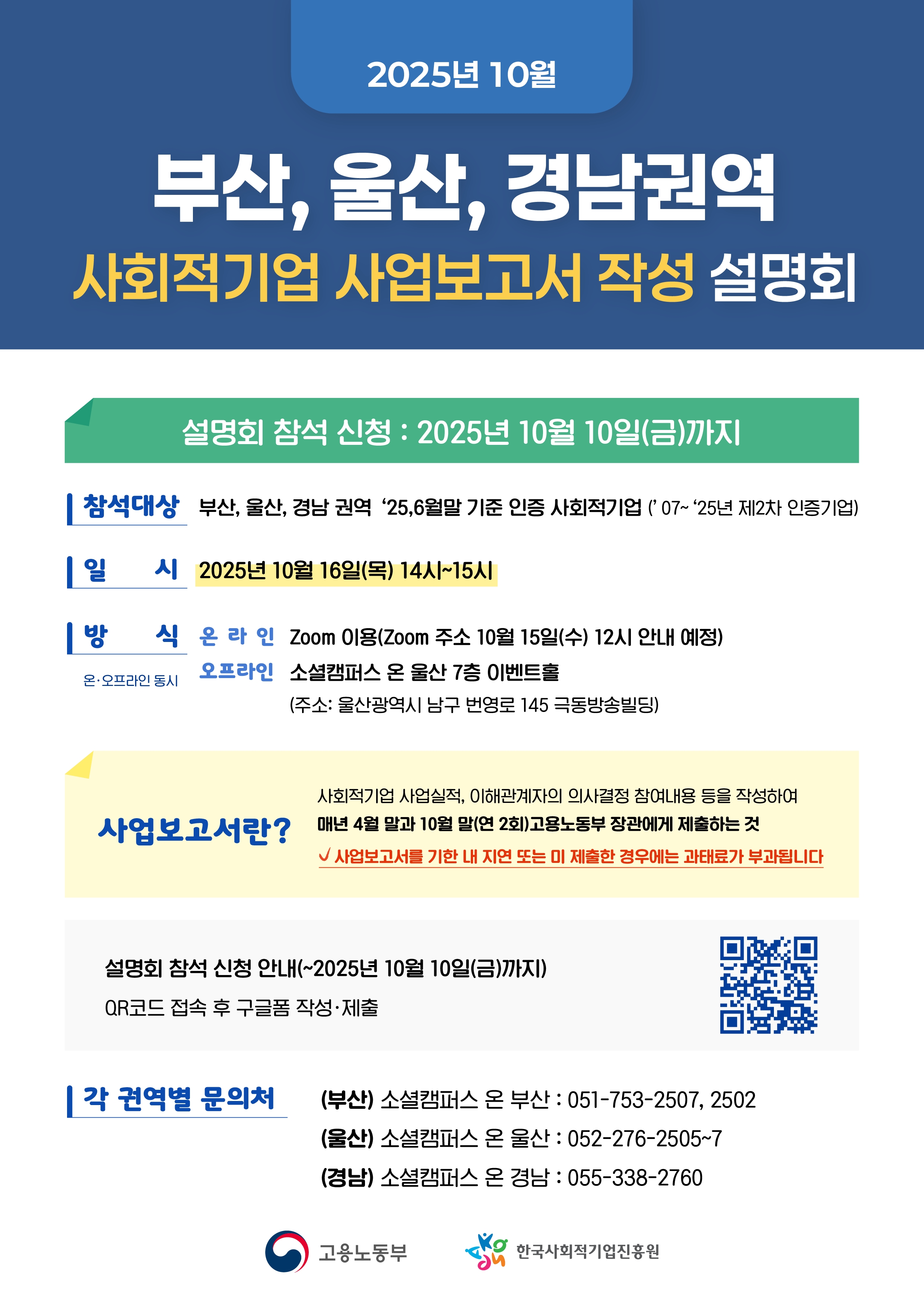 한국사회적기업진흥원 부산통합센터에서 부산, 울산, 경남 권역 소재 인증 사회적기업 대상으로 2025년 10월 제출 사회적기업 사업보고서 작성 설명회를 개최하오니, 많은 참여 부탁드립니다.